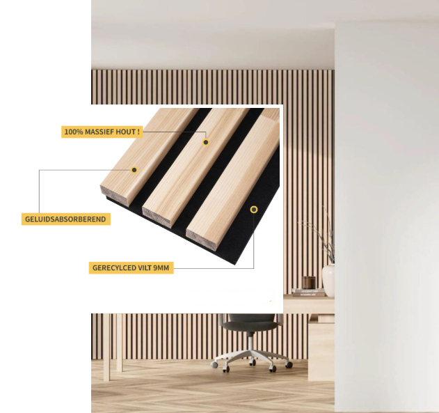Onze akoestische wandpanelen zijn geluiddempend. Achter de eiken lamellen zit een zwarte viltlaag, gemaakt van gerecycled plastic flessen van 9mm dik, door deze premium kwaliteit hebben onze akoestische wandpanelen ook een geluidsisolatie van R=0,94. Door de geluidsisolatie, heb je minder last van omgevingsgeluid. Denk bijvoorbeeld aan een kantoor vol mensen of een huis met kleine kinderen. Door de geluidsisolatie van de akoestische wandpanelen, heb je hier geen last meer van. Dat maakt onze panelen idaal voor kantoren, keukens en kinderkamers