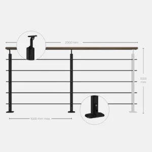Deze aluminium balustrade is ontworpen en geproduceerd in Europa en heeft een strak design en verfraait uw binnen- en buitenruimtes. Met zijn eigentijdse stijl en zorgvuldige afwerking past hij perfect op tussenverdiepingen, terrassen, balkons of moderne trappen en biedt hij een esthetische en veilige oplossing.