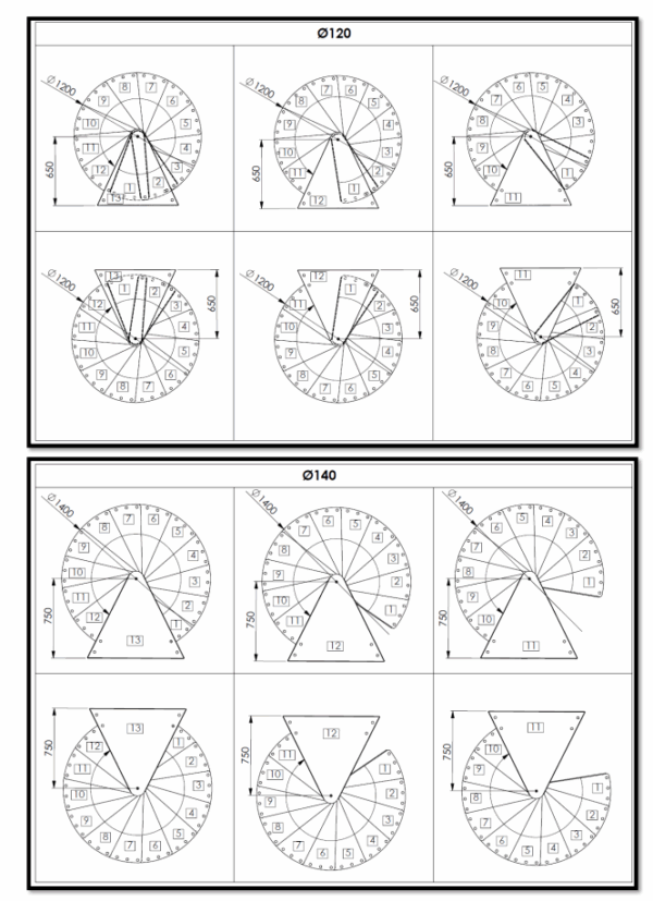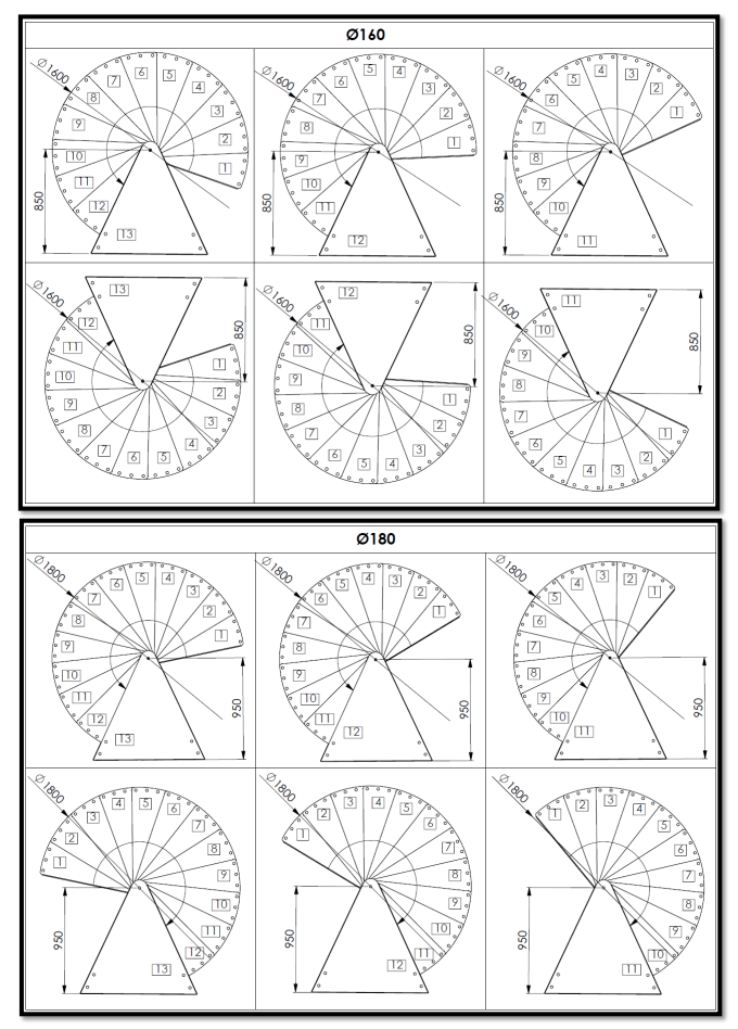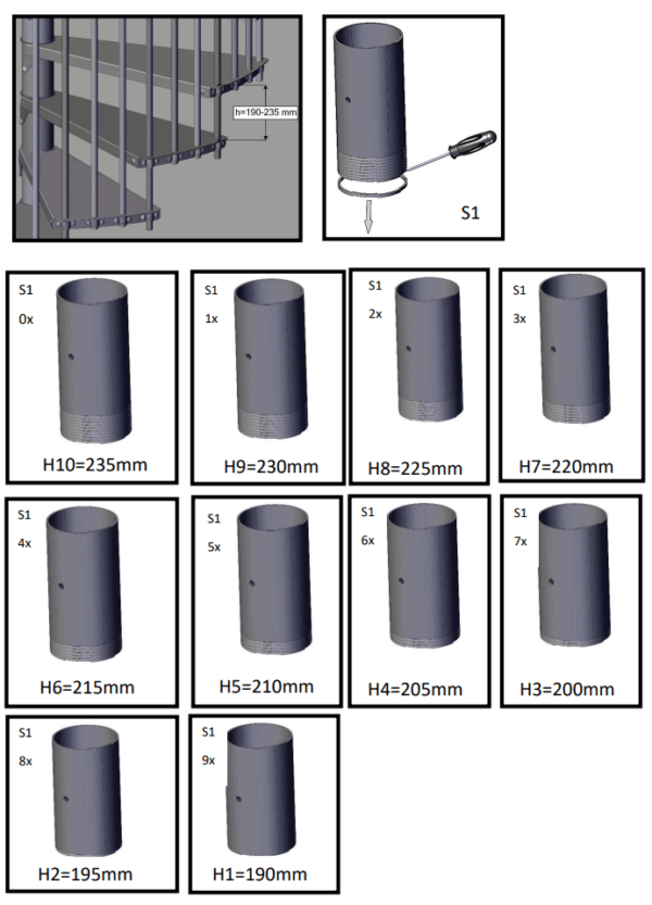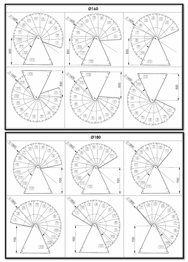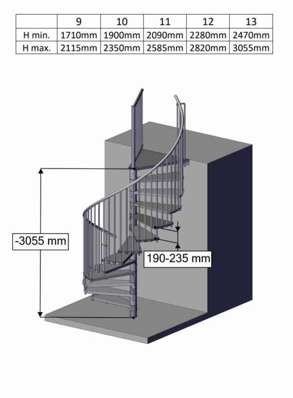 Deze trap is verkrijgbaar in drie verschillende afmetingen. Afhankelijk van de beschikbare ruimte kunt u kiezen uit een diameter van 120, 140, 160 of 180 cm. De spindelelementen zijn in hoogte verstelbaar, waardoor u de totale hoogte van de trap nauwkeurig kunt afstemmen op uw specifieke situatie. Zonder verhogingen bereikt de trap een maximale vloer-tot-vloerhoogte van 3055 mm.