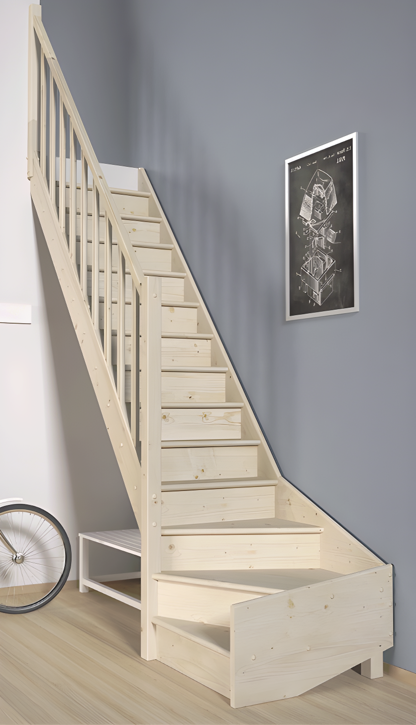 Dit model is een trap met een onderkwart, leverbaar als linksdraaiende of rechtsdraaiende trap. Deze trap heeft een beperkte uitval en is daarom ideaal voor als je beperkte ruimte hebt. De trap wordt geleverd verpakt in dozen, inclusief schroeven en een zeer uitgebreide montagehandleiding. Deze modulaire trap is leverbaar in 2 breedte maten. Ook kan de trap compleet worden gemaakt met een houten balusterleuning en tegentreden.