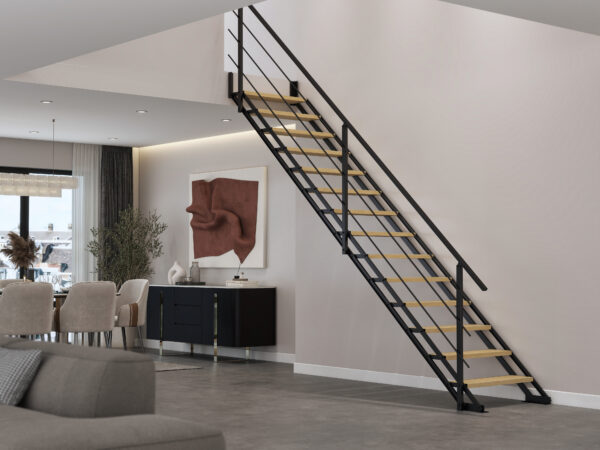 Dit model is een moderne rechte trap met metalen wangen en beuken treden. De trap is leverbaar met of zonder metalen trapleuning. De leuning kan zowel links als rechts gemonteerd worden.