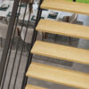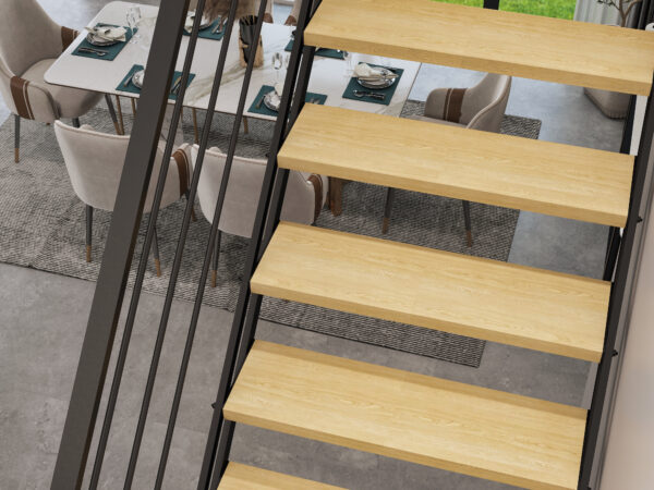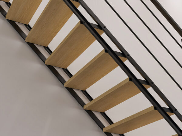 Deze rechte moderne trap is gemaakt van metalen zijkanten die gepoedercoat worden. De treden zijn gemaakt van (30mm) onbehandeld beukenhout. De treden zijn 75cm breed en 25cm diep en hebben een goed loop comfort. De trap wordt standaard geleverd zonder leuning, deze kan optioneel worden besteld. De leuning en de balustrade zijn volledig gemaakt van metaal en worden geleverd in dezelfde kleur als de trap.