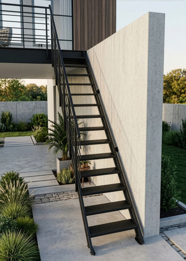 Deze trap is een rechte metalen buitentrap en de ideale oplossing voor terrassen, verhoogde ingangen en vele andere toepassingen rondom het huis. Hij overtuigt met zijn functionele ontwerp, hoge duurzaamheid en moderne uitstraling die een stijlvolle touch geeft aan elke buitenruimte.