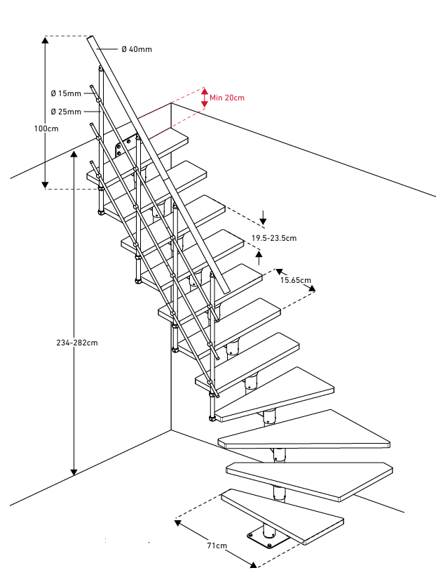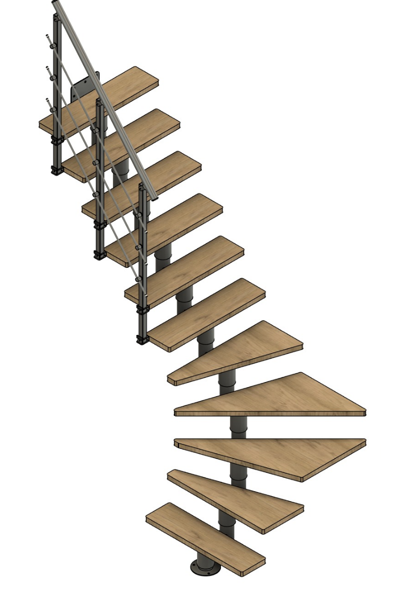 Heb je weinig ruimte maar wil je geen concessies doen aan uitstraling en kwaliteit? Deze kwartslagtrap is dé ideale oplossing voor compacte ruimtes. Dankzij het slimme ontwerp en de flexibele opstelling benut je elke centimeter optimaal, zonder in te leveren op comfort. De metalen trap is speciaal ontwikkeld voor situaties met beperkte inbouwruimte. Met maar liefst 3 configuratiemogelijkheden voor de kwartslag (4 draaitreden) pas je de trap eenvoudig aan jouw situatie aan. Hierdoor is hij geschikt voor een vloerhoogte van 234 tot 282 cm en verschillende opstellingen in breedte en lengte. Deze trap wordt geleverd als bouwpakket en is ontworpen voor snelle en eenvoudige zelfmontage. Ideaal voor zowel doe-het-zelvers als professionals.