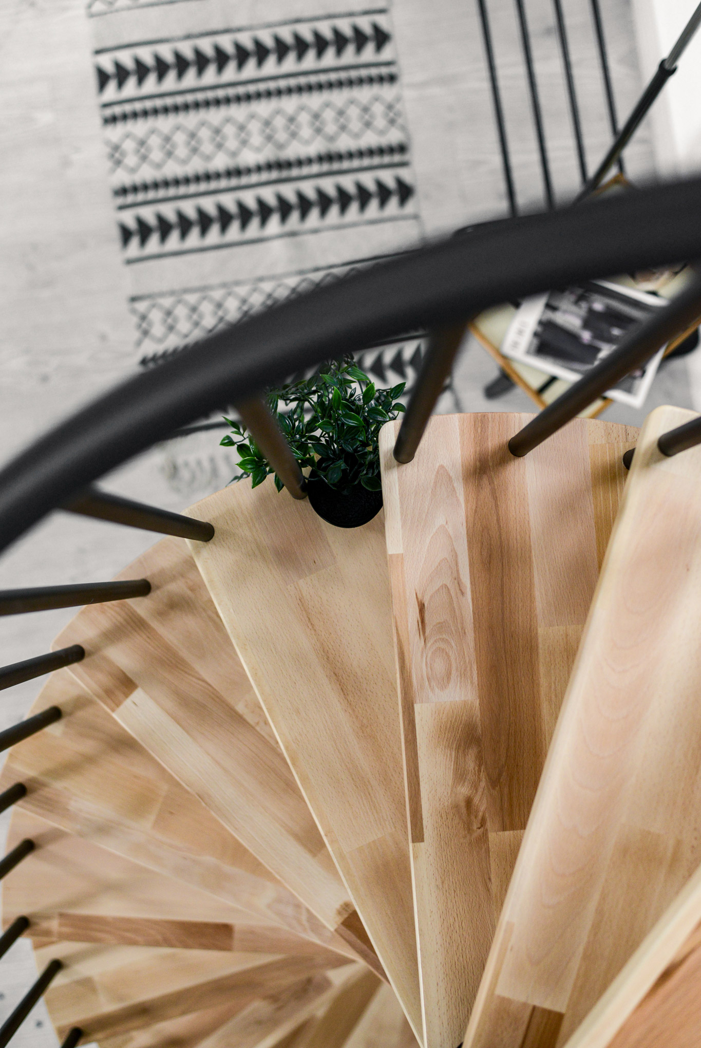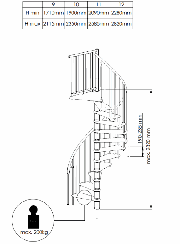 Deze wenteltrap heeft treden van beukenhout (30mm) en 1 eind plateau. De treden zijn reeds behandeld met blanke lak en zijn gereed voor gebruik. De spil is gemaakt van gepoedercoat metaal en de leuning is gemaakt van PVC. De trap is beschikbaar voor een hoogte tussen de 267 en 329 cm. Deze trap is leverbaar voor een diameter van 120 of 140cm