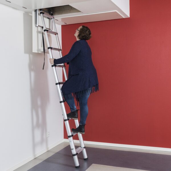 Deze telescopische vlizotrap is de ideale optie voor wie op zoek is naar veilige, ruimtebesparende en efficiënte toegang tot de zolder. Dankzij het slimme telescopische ontwerp laat deze ladder zich eenvoudig in- en uitschuiven, wat zorgt voor optimaal gebruiksgemak. Perfect voor woningen met beperkte ruimte. De treden hebben een antislip profiel voor extra grip en veiligheid. Dit compacte design heeft een draagvermogen van 150KG. Deze vlizotrap is geschikt voor zolders met een hoogte van max 255 cm. In ingeschoven toestand neemt de ladder zeer weinig ruimte in, waardoor hij perfect is voor moderne woningen met beperkte ruimte.